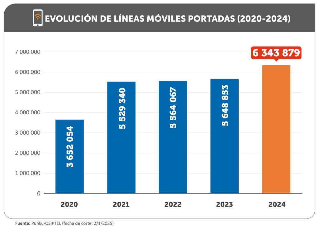 Durante 2024,6.3 millones de líneas móviles cambiaron de operador en Perú,la cifra más alta de portabilidad numérica en el último lustro,informó el Organismo Supervisor de Inversión Privada en Telecomunicaciones (Osiptel).