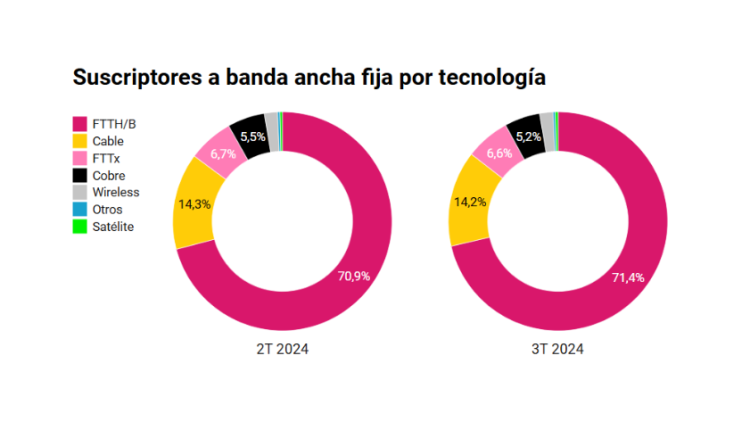La fibra óptica al hogar y al edificio (FTTH/B) se consolida como tecnología dominante para el acceso a banda ancha fija en el mundo. Al tercer trimestre de 2024,su participación creció al 71.3 por ciento,lo que es igual a 8 por ciento de incremento interanual. Otro 6.7 por ciento corresponde a FTTx,que se posicionó como tercera opción más usual detrás del cable.